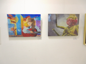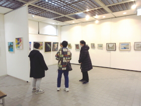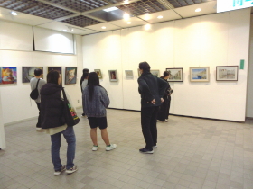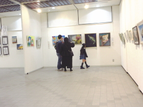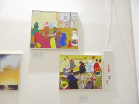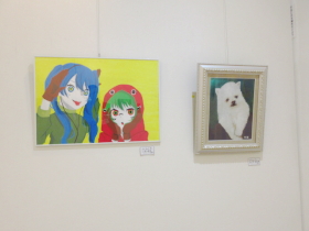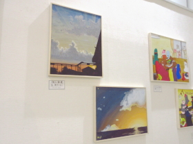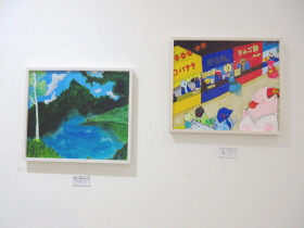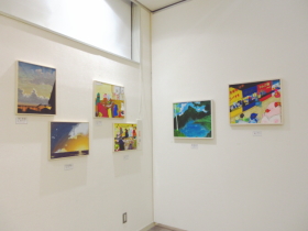 | 入口から入って正面奥のスペースでは、子どもたちが描いた油彩作品やアクリル画を展示しました。 |