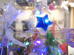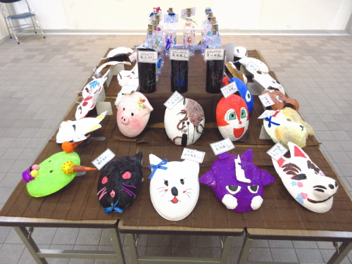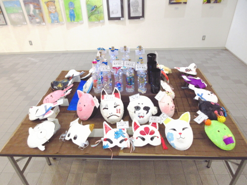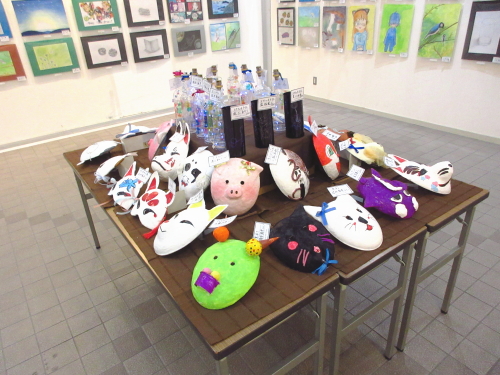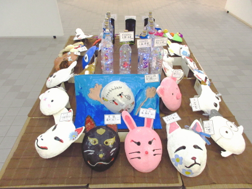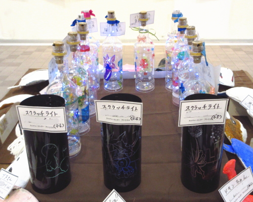| 展示室の会場奥では、子どもたちが作った工作作品(スクラッチライト、お面の作品)を展示しました。 |